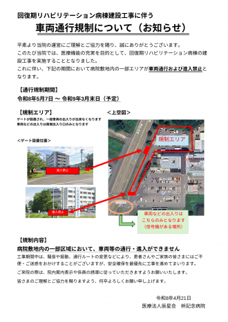 これに伴い、下記の期間において病院敷地内の一部エリアが車両通行および進入禁止となります。